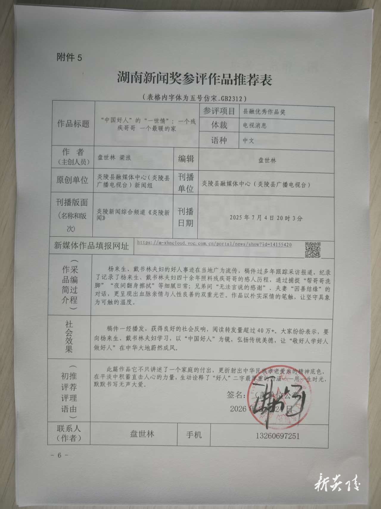 炎陵县融媒体中心+电视+长消息+《“中国好人”的“一世情”:一个残疾哥哥 一个最暖的家》推荐表.docx