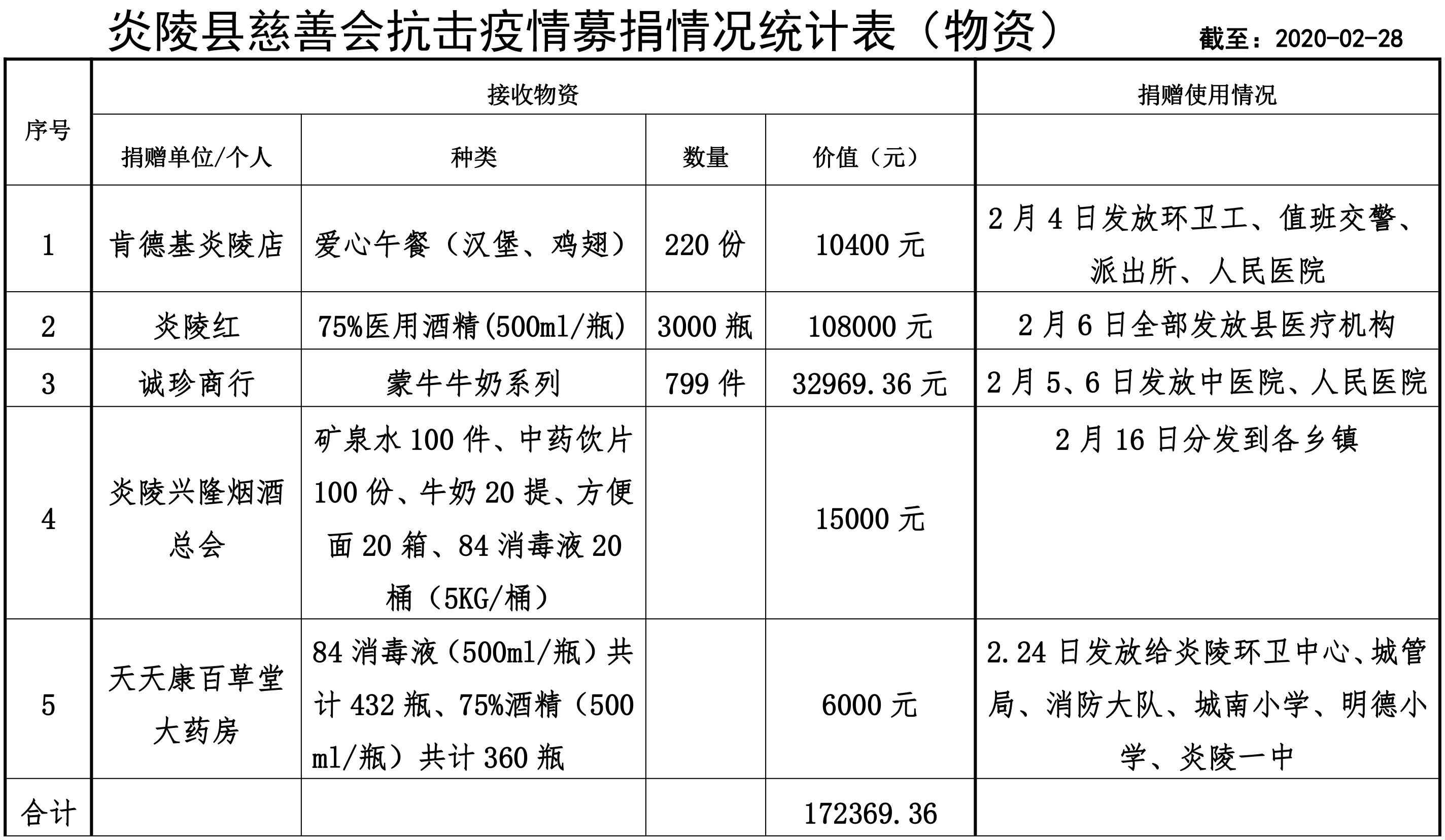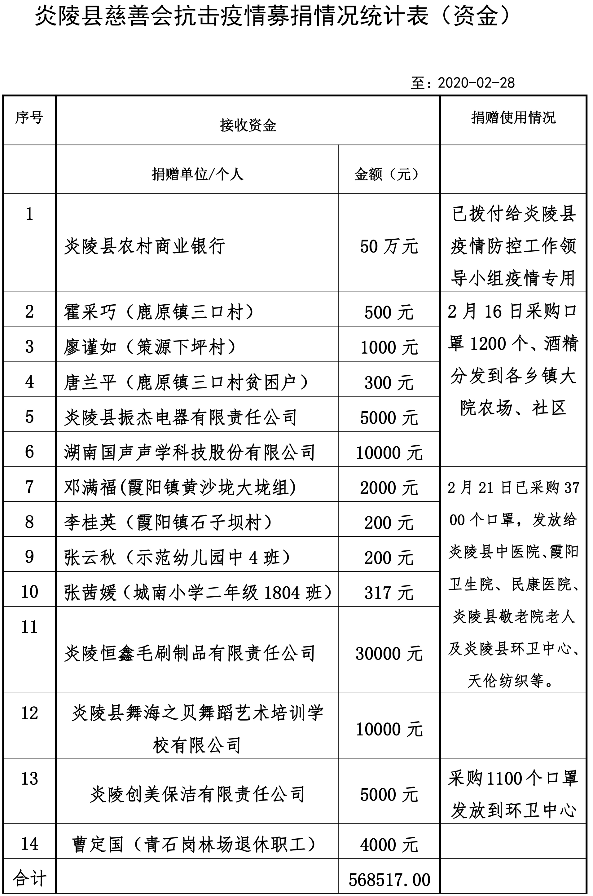 为科学有序做好新型冠状病毒感染的肺炎疫情防控工作,县慈善会于2020年2月1日发起抗击新型冠状病毒感染的肺炎疫情募捐倡议,广泛动员社会慈善力量参与疫情防控捐赠,得到社会各界的积极响应与大力支持。截止2月28日止,累计接受捐赠资金568517.00元,捐赠物资价值172369.36元。根据县疫情防控工作领导小组的统筹安排,现将捐赠情况及使用情况向社会公布如下(见附表):